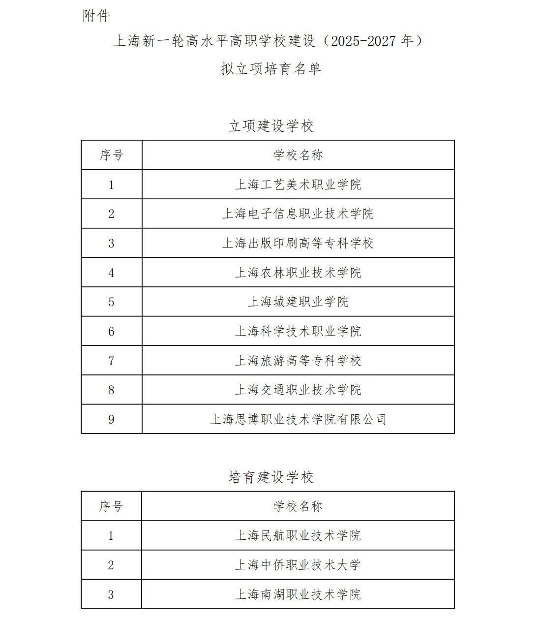關(guān)于上海新一輪高水平高職學(xué)校建設(shè)(2025-2027年)擬立項培育名單的公示