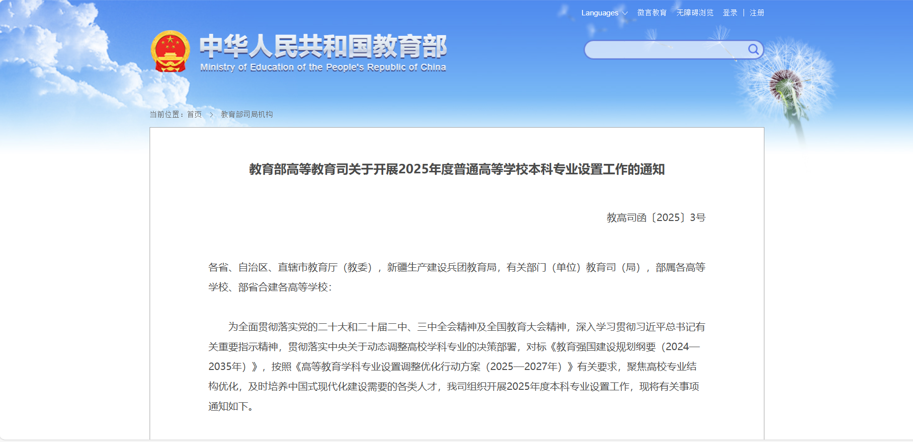 為全面貫徹落實(shí)黨的二十大和二十屆二中、三中全會精神及全國教育大會精神,深入學(xué)習(xí)貫徹習(xí)近平總書記有關(guān)重要指示精神,貫徹落實(shí)中央關(guān)于動態(tài)調(diào)整高校學(xué)科專業(yè)的決策部署,對標(biāo)《教育強(qiáng)國建設(shè)規(guī)劃綱要(2024—2035年)》,按照《高等教育學(xué)科專業(yè)設(shè)置調(diào)整優(yōu)化行動方案(2025—2027年)》有關(guān)要求,聚焦高校專業(yè)結(jié)構(gòu)優(yōu)化,及時(shí)培養(yǎng)中國式現(xiàn)代化建設(shè)需要的各類人才,我司組織開展2025年度本科專業(yè)設(shè)置工作,現(xiàn)將有關(guān)事項(xiàng)通知如下。